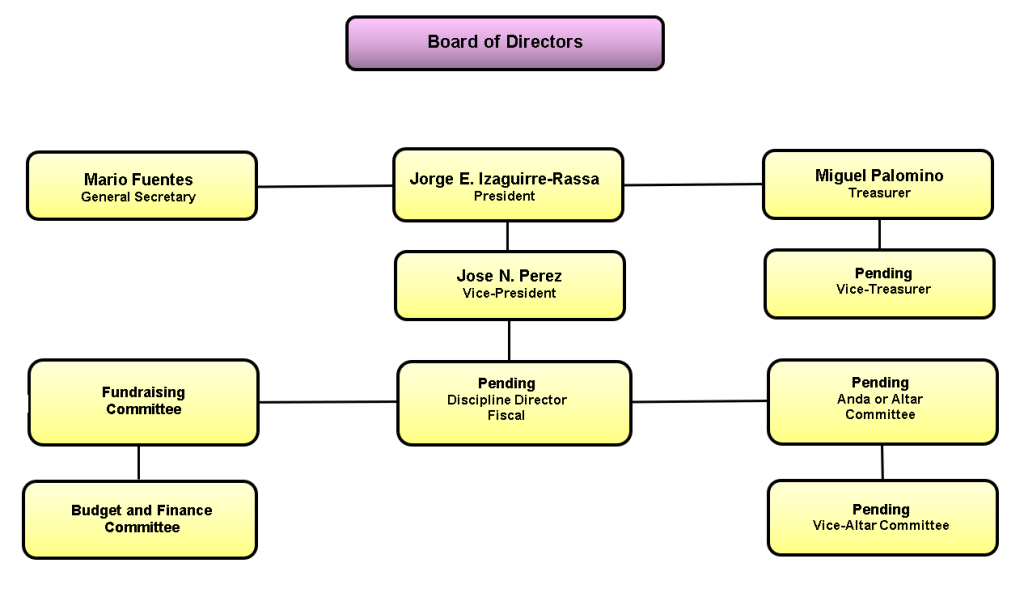 - Regular meetings plan events. The central tradition is the annual procession of the Lord of Miracles.